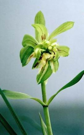 多瓣蝶花。花葶特高,约有15-16厘米,并呈丫形树技状分叉,一葶双龙,一高一低,遥相呼应。每花有20-30瓣之多。开花时,花瓣分轮逐层展开:第一层约在花朵下方2厘米处,花瓣3-4片,呈弯扭状对生或互生,第二三层里均可见到数量不等的波状唇瓣与半蝶化瓣夹生一起,第三四层里能见到外形起伏,带少量红点的唇瓣相互紧裹。花期达两月之久,芳香亦能持续。整花充实、奇俏,引人神往。植株健壮、健花,叶形细狭叶沟深,叶质硬挺、叶缘锯齿较细密,叶色黄绿、叶端尖。1988年舟山张根友选出,现舟山仅数人栽培。兰奴供照