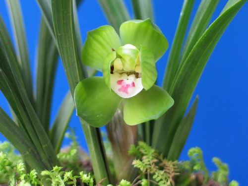 特征:外瓣短宽,放角收根,蚌壳捧,刘海舌。瓣、 捧、舌变化很大,时有多瓣、多捧、多唇出现,列为奇之列。葶高,苞叶绿色,叶短阔,质厚,直立,常有旋转扭曲。叶尖钝,有光泽,喜阴耐肥,为春兰中最高品位之花。