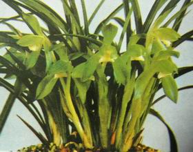 清代宣统年间为绍兴刘茂成选育。叶姿半垂,叶幅宽阔,叶质厚硬,叶端尖长。叶色深绿,有光泽。苞壳翠绿色,有绿筋脉。花外三瓣初开时短圆,收根放角,几天后三瓣伸长,大落肩。蚌壳捧,净白大铺舌,长而翻卷。花色翠绿,属大形花。