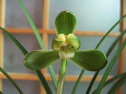 特征:外三瓣短圆,收根紧边。分窠软观音兜捧心,捧瓣前端淡黄色,刘海舌。花品端正,花色俏丽,苞壳玫红。叶斜垂,叶片光亮,叶尖钝。