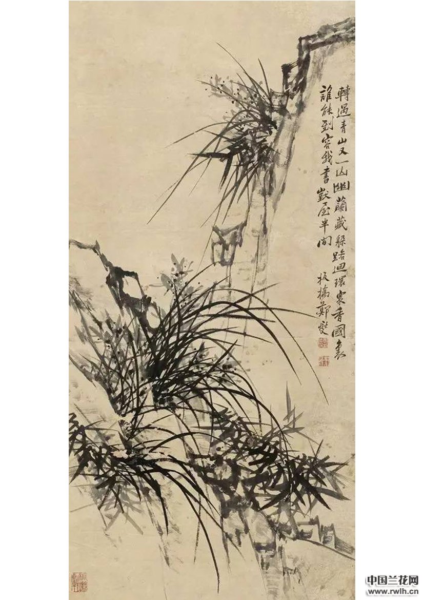 这种用笔的原则,俨然在书画中融入了草书的笔意,着实使他的兰花拥有了非同一般的逸致。同样在他的书法中也融入了绘画法的笔法,他创造了“六分半书”,纵横错落,飘洒有致。三丛兰花,浓墨写就兰叶,俨然如草书的撇捺。俊逸多姿;淡墨渲染兰花,清雅可人,花心用浓墨点出,般配着左下角的题诗:“素心兰与赤心兰,总把芳心与客看。岂是春风能酿得,曾经霜雪十分寒”。兰花的芳心跃然纸上,散发出幽香。