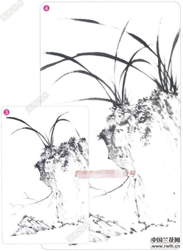 3&4.以小号狼毫笔或兼毫笔在山石后画出竹枝干,用笔要潇洒、果断,再用深浅不同的墨色在峭壁上面撇出两丛兰叶,兰叶的朝向、长短、大小要各不相同,山石、兰叶、竹枝的形态要相互呼应、协调。