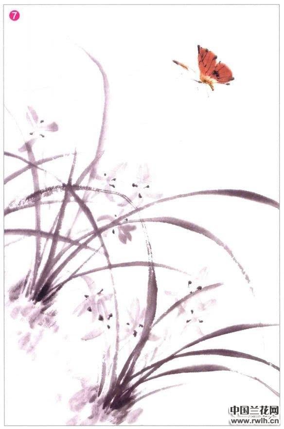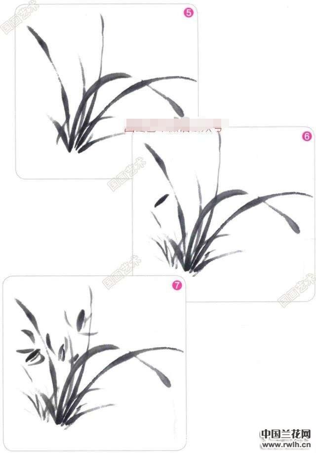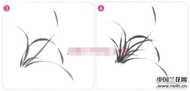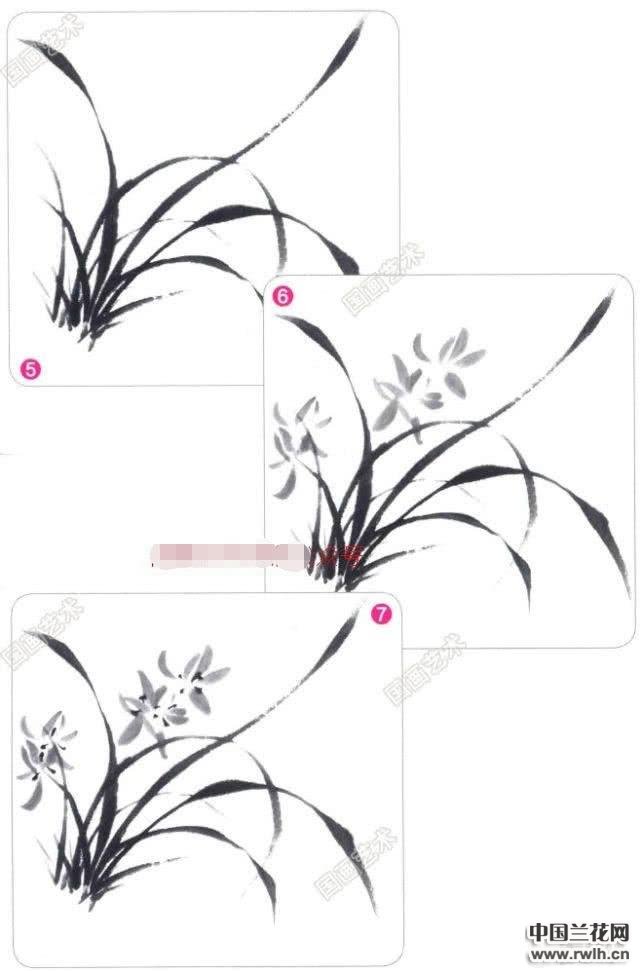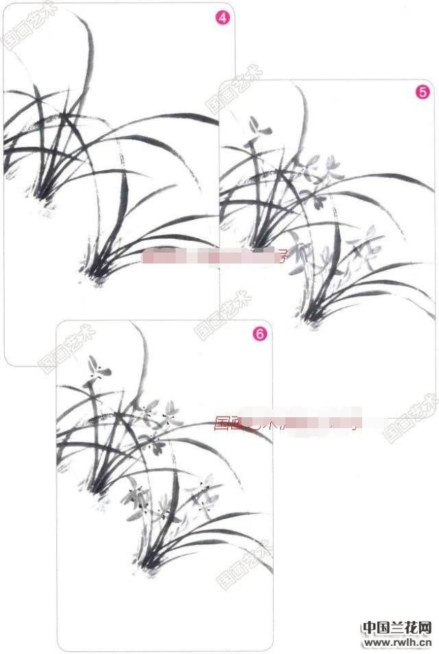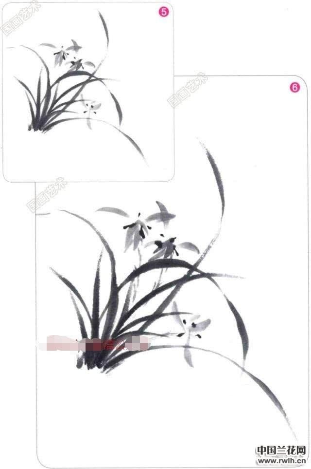 5&6.在兰叶间以淡墨画出兰花的形态,并以浓重的墨色点出 花心。
