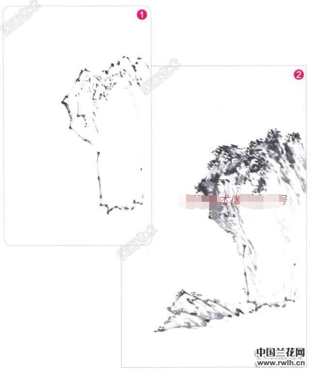 2.以浓墨皴擦山石的暗部,墨色要有深浅的自然变化,以突出山石的凹凸质感,再以浓重点苔,苔点要有疏密结合,最后画出峭壁下的山石形态,注意大小、前后、高低的对比。