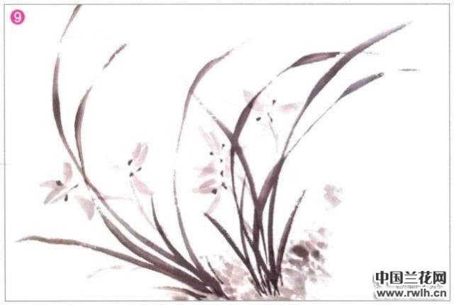 7.把墨色调淡,在兰叶丛间画出兰花的形态,注意花瓣的长短、深浅变化以及花头的朝向。