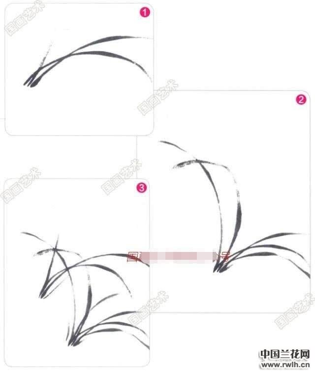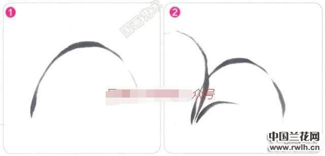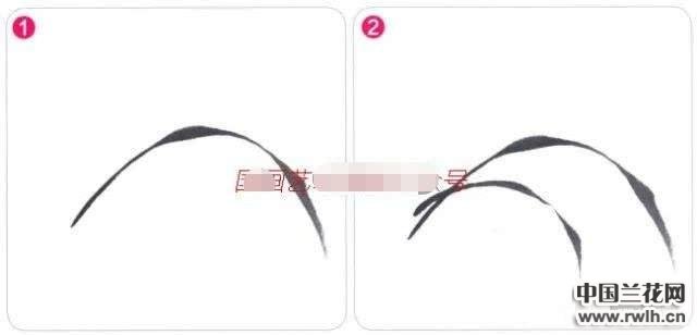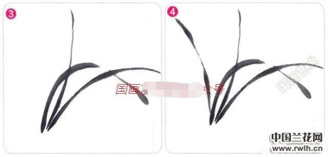 1&2.确定好构图,选用一支小号兼毫笔,画出或下垂、或上扬的兰叶形态,兰叶成丛出现,根据呈聚拢的形态,画兰叶时要注意收笔留锋,表现出兰叶的飘逸。